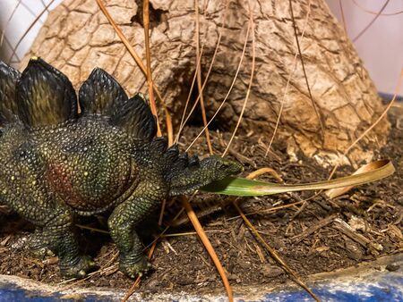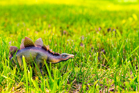 toy dinosaur in tall green grass in the garden. Stegosaurus (lat. Stegosaurus) - a genus of late Jurassic herbivorous dinosaurs