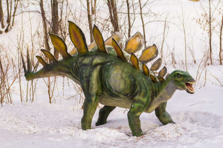plastic figure of a dinosaur in dinopark on snow background