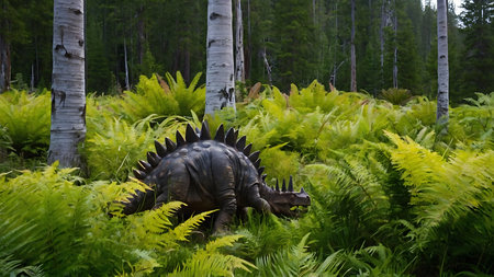 Stegosaurus roaming a lush, sunlit prehistoric forest, majestic and ancient
