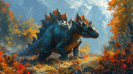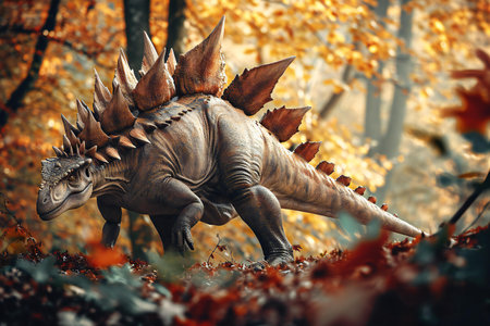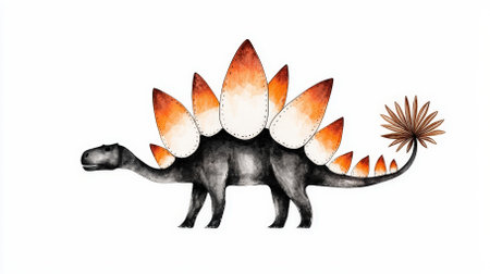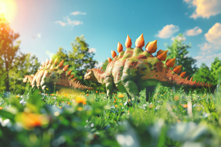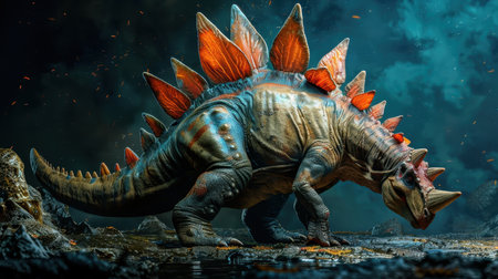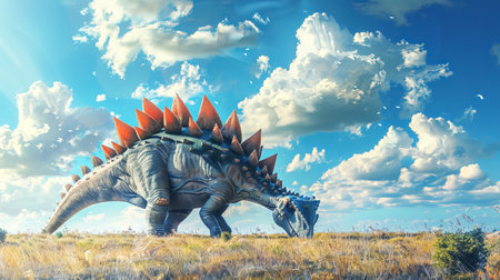 Vibrant illustration of a Stegosaurus in a prehistoric landscape. Concept of dinosaurs, ancient wildlife, nature, educational content, dinosaur.
