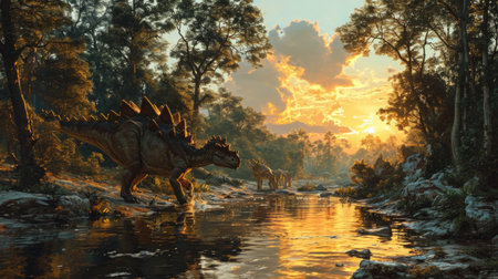 A stegosaurus strolls near the riverbank, its distinct plates glowing under the warm sunlight. Tall conifers rise behind the dinosaur, creating a serene prehistoric landscape.