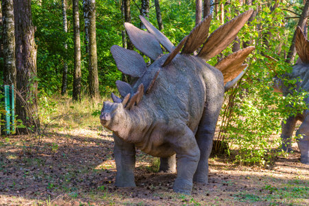 Belgorod, Russia - September 10, 2022: Statue of stegosaurus in park. Dinopark of Belgorod city.