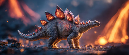 A stegosaurus balances on its hind legs against a volcano erupting with flowing lava, surrounded by glowing effects and bright colors in a dynamic setting.