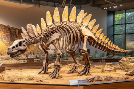 Full body stegosaurus dinosaur skeleton standing on display in paleontology museum. Model of predator made of bones from prehistoric period