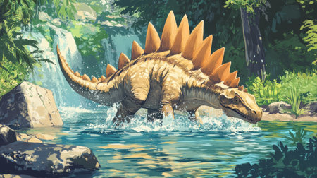 A young Stegosaurus plays joyfully in a river, creating ripples with its tail. The clear water sparkles in the sunlight amid vibrant foliage and rocks.