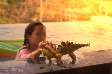 toy for near poolside on blur girl playing in swimming pool background in summer vacation with sun light
