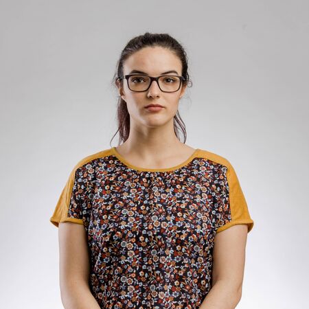 A young man with a beard stands upright, looking directly at the camera. He wears a plain black t-shirt and gray pants. The background is neutral and simple, emphasizing his expression.