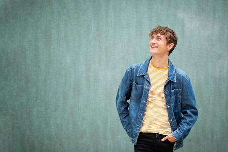 A full-body shot of a young man dressed in a t-shirt, jeans, and a jacket, with his hands in his pockets.