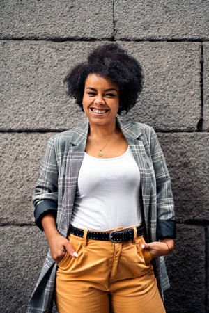 Smiling woman portrait in front of a brick wall - Beautiful brunette standing and looking at camera - Candid portrait of a beautiful young woman in London