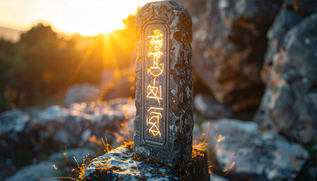 As the sun sets over a rugged landscape, a mysterious ancient stone pillar is revealed. Golden runes, carved deep into its surface, pulse with an otherworldly light, hinting at forgotten magic, ancient secrets, and epic quests yet to come.