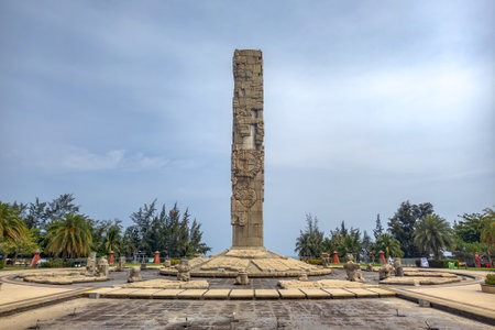 Totem column on the central square in Yalong Bay. Beautiful view from the height of the city, the beach and the sea. Sanya City, Hainan Island, China.