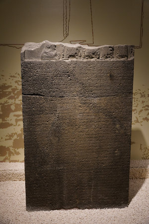 A weathered stone tablet, covered in ancient script, is dramatically lit in a museum setting.