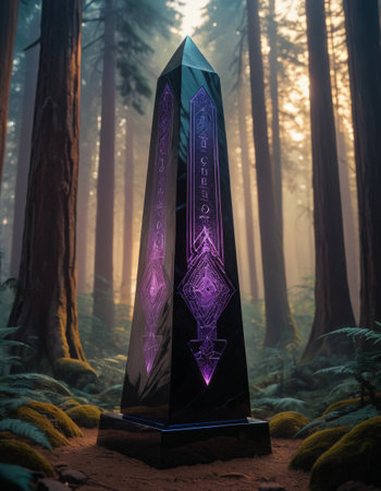 A majestic obelisk rises towards the clouds, its geometric structure emphasized by a luminous core that casts an enchanting glow against the twilight sky