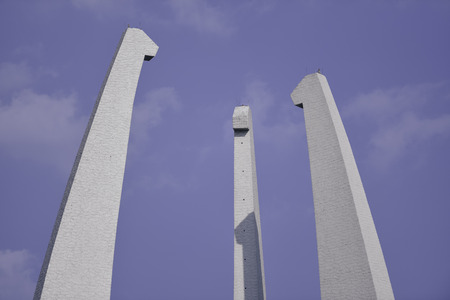 A low angle view of a large concrete cross against a bright blue sky with white clouds.