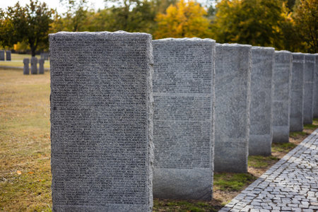 Kyiv. Kyiv region. Ukraine. 13.10.2023. Stone tombstones in the German cemetery in the fall. Beautiful German cemetery near Kyiv. Many dead German soldiers of the dead during the 2nd World War.