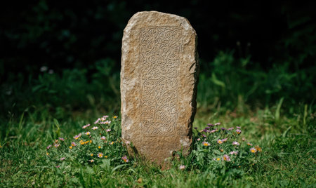 A weathered headstone, adorned with intricate carvings, stands amidst tall grass in a serene rural setting This evocative image captures remembrance, blending history and nature Its weathered details invite reflection within the tranquil, nostalgic scene The idyllic escape inspires appreciation for the past AI Generative