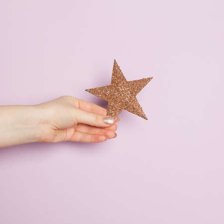 Minimal Christmas background card. Beautiful female hand holding golden Star on lilac background