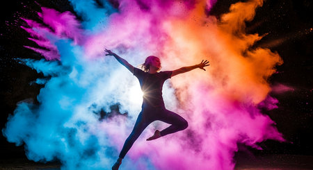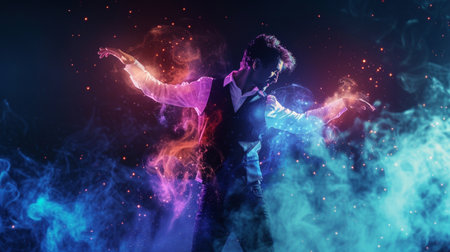 Talented male dancer gracefully performing on a brightly lit stage, illuminated by vibrant spotlights
