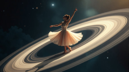 In a cosmic setting, a dancer twirls elegantly on the iconic rings of a planet, embodying grace and artistry amidst the vastness of space, illuminated by faint starlight.
