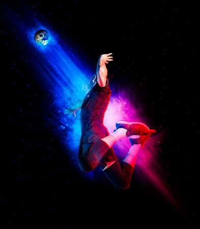 Young flexible male dancer dancing in magenta neon light. Concept of dance, youth, energy, night life, dynamics, fashion, style, ad. Amplitude dance movements. Banner with copy space