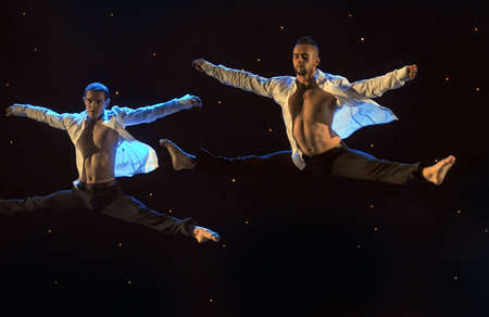 Two dancers perform energetically under colorful lights, creating a captivating visual effect at night.