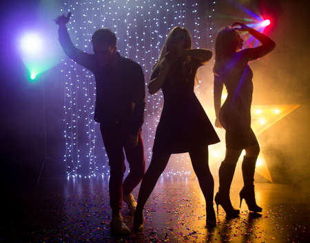 Young stylish girls dancing in the Studio on a colored neon background. Music dj poster design.