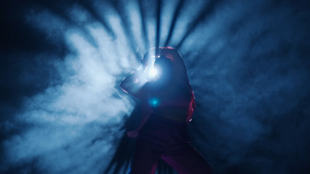 Breakdance guy showing dance elements wearing urban clothes in studio spotlight. Dancers team performing hip-hop illuminated bright backlight. Agile b-boy jumping showing freestyle in nightclub.
