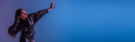 African american woman wearing smart glasses and leather jacket on blue and purple background, banner