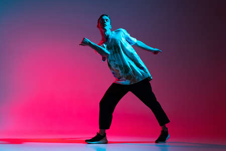 Full-length horizontal portrait of young male hip-hop dancer practising isolated over gradient pink purple background in neon light