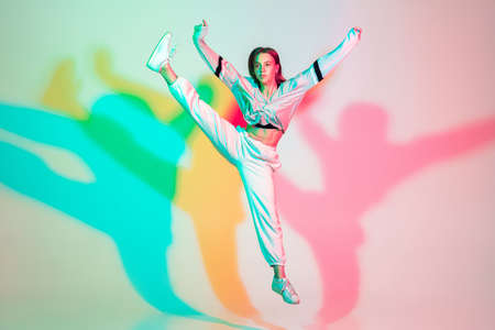 Young beautiful woman dancing hip-hop, street style isolated on studio background in colorful neon light. Fashion and motion, youth, music, action concept. Trendy clothes. Copyspace for ad.