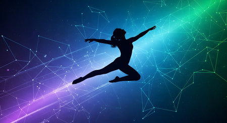 A captivating silhouette of dancers on stage, showcasing their dynamic movements and unity under dramatic lighting effects, expressing energy and artistry.