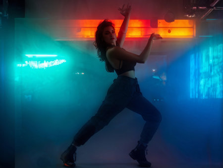 Dancing mixed race young girl in colourful neon studio light. Female dancer in white stylish sportswear. Long exposure