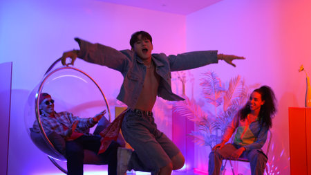 Skilled asian dancer moving to modern music while multicultural friend sitting at chair. Professional performer dancing show energetic foot step while hipster team cheering and supporting. Regalement.