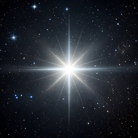 Bright star shining in night sky, surrounded by twinkling stars, creating stunning celestial display. vibrant light radiates with starburst effect, captivating viewers