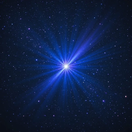A luminous blue starburst emits powerful light rays into a deep, dark sky filled with countless stars, showcasing a vibrant celestial phenomenon.