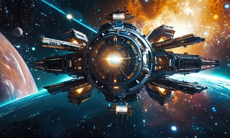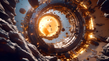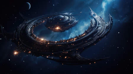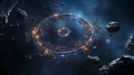 A complex, circular structure dominates the image, featuring intricate mechanical details and numerous glowing lights. The design suggests a futuristic space station or similar technology. The scene is presented with dark tones and a blurred background, possibly representing outer space. The image may be suitable for science fiction concepts, design projects, and visual content.