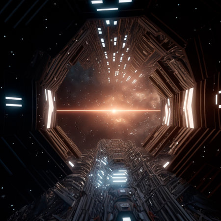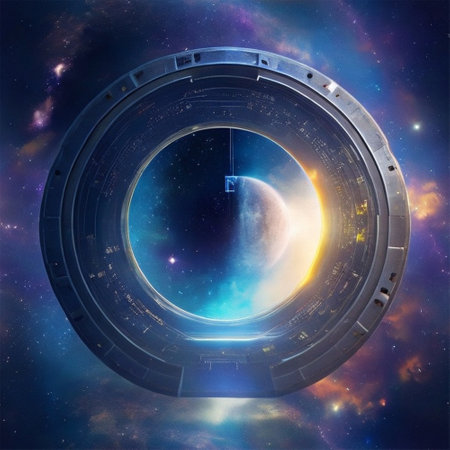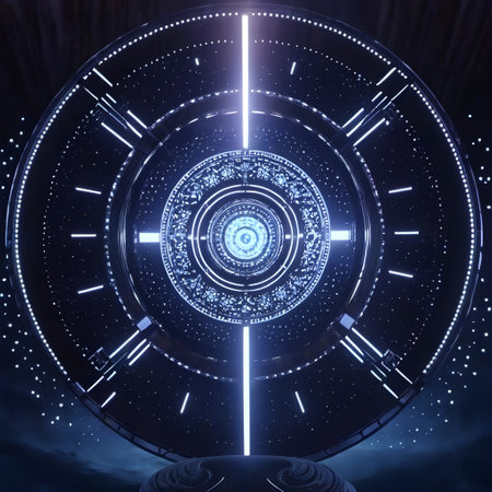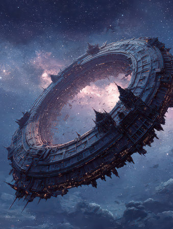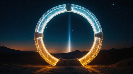 This image depicts a futuristic, circular space portal or stargate floating in the cosmos. It features multiple concentric rings adorned with intricate, glowing patterns and symbols. A central beam of light pierces through the middle, extending both upwards and downwards, surrounded by a backdrop of starry space. The overall design is highly detailed, emphasizing a blend of advanced technology and cosmic mystery.