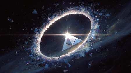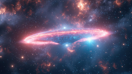 A cosmic ring structure with a glowing sun and galaxies in deep space. Clear details and vibrant colors enhanc...