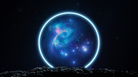 New worlds of galaxies panorama, fantasy portal to far universe. Space exploration, round gateway to another universe, landscape. 3d render