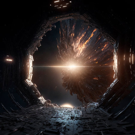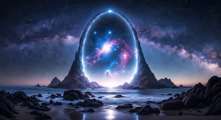 A celestial gateway opens to a vibrant planet amidst floating rocks in a cosmic landscape, ideal for sci-fi and fantasy themes. Fantasy illustration.