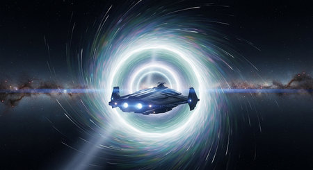 A futuristic spaceship traveling through a glowing wormhole, bending light into colorful spirals of energy.