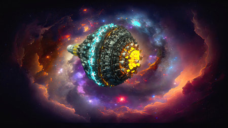 A white and orange spherical spacecraft cruises through the interstellar space, featuring a beautiful composition and cinematic aesthetics