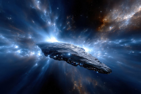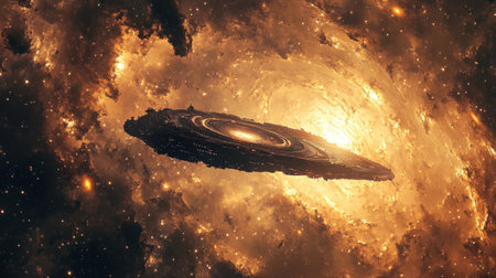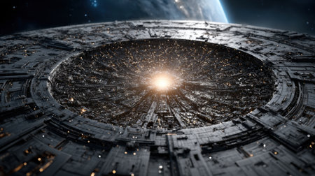 A massive spacecraft is carefully positioned in outer space, revealing an intricate surface with detailed machinery and a bright core at its center. The scene illustrates advanced technology.