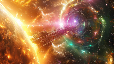 A sleek spaceship travels through a vibrant wormhole surrounded by swirling energy and colorful light effects in deep space