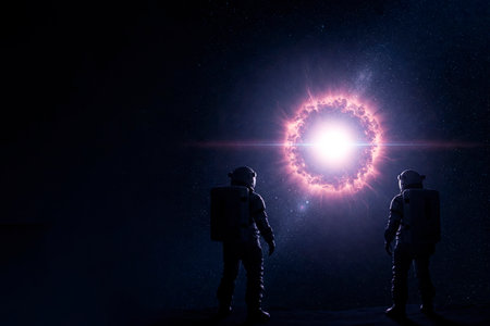 Two astronauts observe the explosion of a bright star in space. Space for text