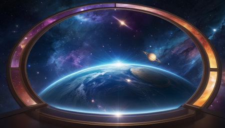 A futuristic 3D background of an advanced space station orbiting a distant exoplanet. The sleek metallic corridors are illuminated by soft white LED panels, with large observation windows revealing a mesmerizing view of swirling cosmic nebulae.