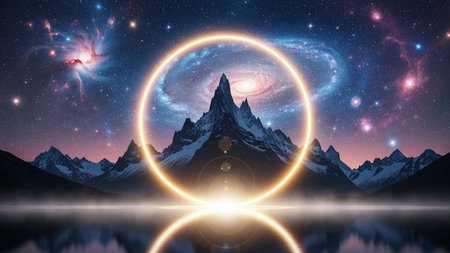 This surreal cosmic landscape a mountain range silhouetted against a vibrant night sky filled with swirling galaxies and colorful nebulae. A large, luminous golden ring encircles the central mountain peak, emanating a bright glow that reflects on the still water below. The scene is filled with countless stars and celestial bodies, creating an awe-inspiring and ethereal atmosphere. The interplay of light and shadow, combined with the vastness of space and the grandeur of the mountains, evokes...