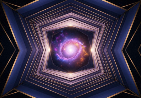 A mesmerizing digital art of a galaxy at the center of a hexagonal tunnel with vibrant colors and geometric patterns.