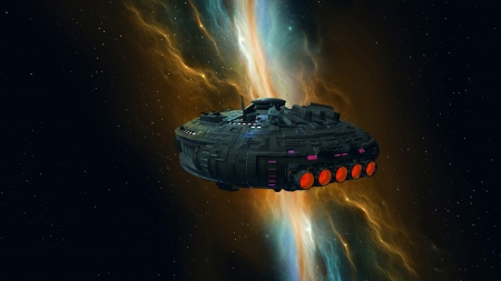 A large, futuristic spaceship glides through a stunning nebula filled with stars and vibrant colors in deep space.