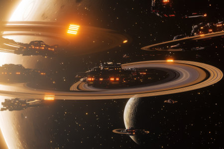 A fleet of advanced spacecraft maneuvers through luminous rings surrounding a distant planet in space.